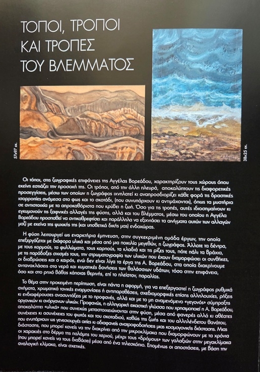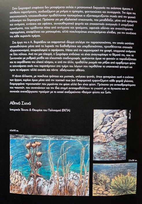 Η Αθηνά Σχινά, Ιστορικός Τέχνης & Θεωρίας του Πολιτισμού (ΕΚΠΑ) συνοδεύει τον κατάλογο της έκθεσης με μία ανάλυση προσεγγίζοντας τα έργα μέσα από το βλέμμα της ζωγράφου με τίτλο: “Τόποι, τρόποι και τροπές του βλέμματος“.