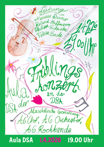 Am Mittwoch, den 1. April, findet um 19:00 Uhr in der Aula der DSA unser Frühlingskonzert statt, bei dem Schülerinnen und Schüler von Klasse 5 bis 12 für Sie singen und musizieren.