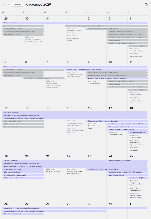 Μία ματιά στο ΗΜΕΡΟΛΟΓΙΟ του Ιανουαρίου αποκαλύπτει ότι είναι γεμάτο από εκδηλώσεις αποφοίτων. Είχαμε αναφέρει ότι έχουμε 20 θεατρικές παραστάσεις στην εφετινή σεζόν, πολλές παρουσιάσεις και εκδόσεις βιβλίων, εκθέσεις και έπονται και άλλα. Ούτε μία ημέρα δεν υπάρχει “ελεύθερη” μέσα στον Ιανουάριο.
