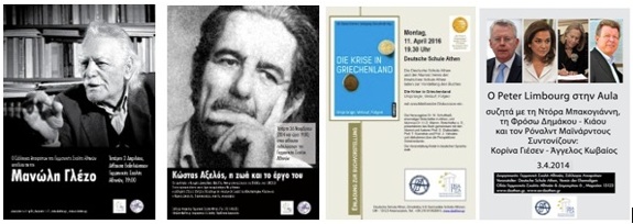 Καλέσαμε στην Aula προσωπικότητες, αποφοίτους και μη, και μίλησαν σε εκδηλώσεις όπως “ο Μανώλης Γλέζος στην Aula”, “die Krise in Griechenland”, “Εθελοντισμός” κ.α., όπου παρελάσανε ο Μανώλης Γλέζος, η Έβη Τουλούπα, η Κατερίνα Δασκαλάκη, ο Τάσος Γιαννίτσης, η Ντόρα Μπακογιάννη, ο Παναγιώτης Πικραμμένος, ο Γιάννης Βαληνάκης, η Φρόσω Δημάκου-Κιάου, ο Ulf-Dieter Klemm, ο Θανάσης Βαλτινός, η Αλεξάνδρα Μητσοτάκη, ο Peter Limbourg, ο Άγγελος Συρίγος και πολλοί άλλοι.