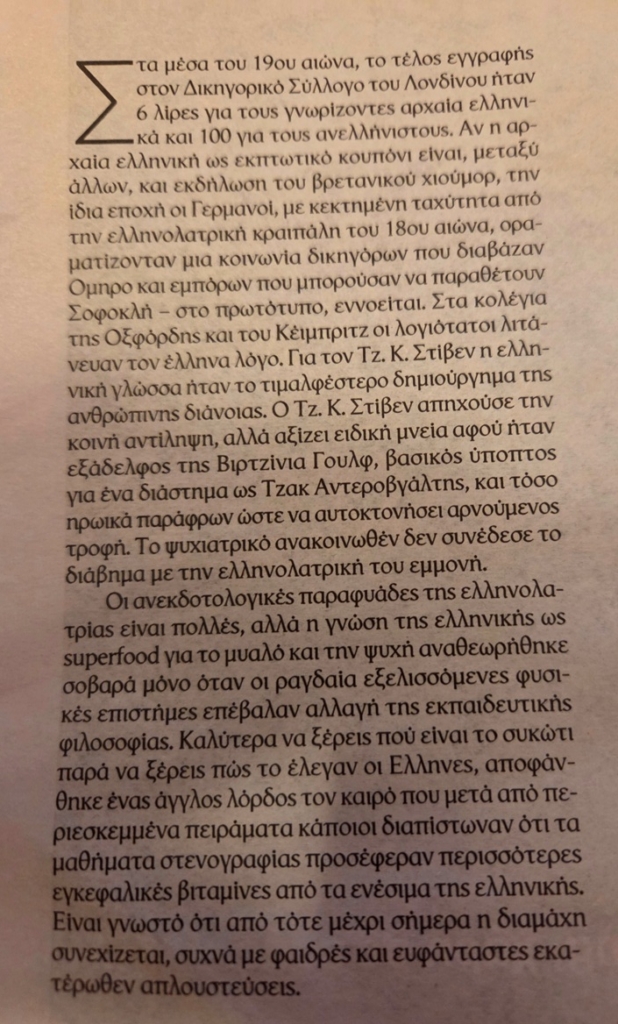 Αν η αρχαία ελληνική ως εκπτωτικό κουπόνι είναι, μεταξύ άλλων, και εκδήλωση του βρετανικού χιούμορ, την ίδια εποχή οι Γερμανοί, με κεκτημένη ταχύτητα από την ελληνολατρική κραιπάλη του 18ου αιώνα, οραματίζονταν μια κοινωνία δικηγόρων που διάβαζαν Όμηρο και εμπόρων που μπορούσαν να παραθέτουν Σοφοκλή – στο πρωτότυπο εννοείται.
