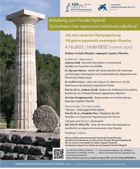 150 Jahre deutsche Olympiagrabung | 150 χρόνια γερμανικών ανασκαφών Ολυμπίας, 4.10.2025 | 16:00 OESZ (τοπική ώρα)