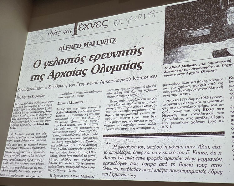 Ο Detlef Mallwitz, μαθητής από το 1957 έως την αποφοίτησή του το 1970, γιός του αρχαιολόγου Alfred Mallwitz -συνεργάτη του DAI (Deutsches Archäologisches Institut) επί 30 χρόνια- διοργάνωσε με το DAI την Πέμπτη 9.10.2025 στο Goethe Institut μία έκθεση από ακουαρέλλες με τίτλο “Olympia und Griechenland 1952-1984: Entdeckungen im Werk von Alfred Mallwitz“, που θα παραμείνει ανοικτή για ένα μήνα, έως τις 9.11.2025, ενώ θα λειτουργεί παράλληλα με τις εκδηλώσεις εορτασμού των 150 χρόνων των ανασκαφών στην Αρχαία Ολυμπία.