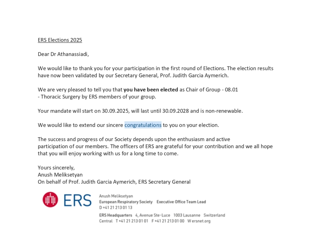 Η Καλλιόπη Αθανασιάδη (’82), μεγάλη Ελληνίδα θωρακοχειρουργός, εξελέγη Chair of Group – Thoracic Surgery της Ευρωπαϊκής Πνευμονολογικής Εταιρείας (European Respiratory Society – ERS).