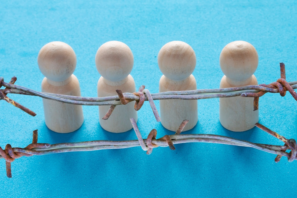 Barbed wire in refugee camp inside buffer zone of the Belarus – Poland border. Migrants behind camp fence. Escalation of migration crisis. Concept of prison, freedom, barrier, security and migration.
