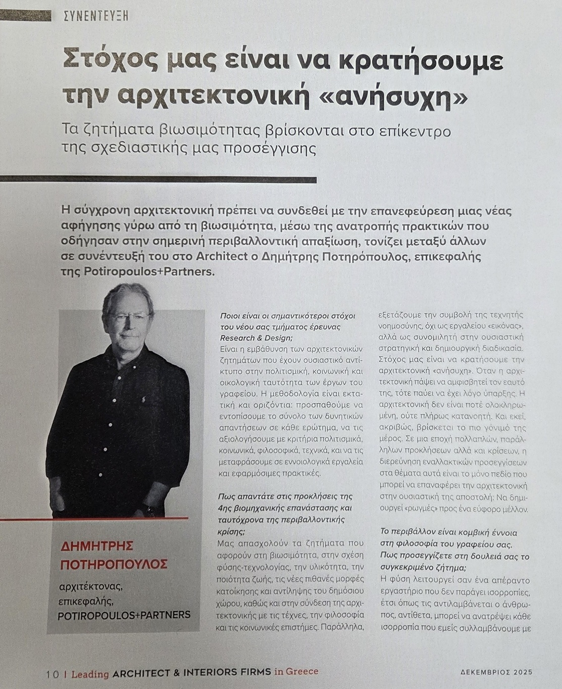 Στο αφιέρωμα “Leading ARCHITECTS + INTTERIORS FIRMS in Greece” της εφημερίδας “Το ΒΗΜΑ” της Κυριακής 14 Δεκεμβρίου 2025 έδωσε ο Δημήτης Ποτηρόπουλος μία συνέντευξη με τίτλο: