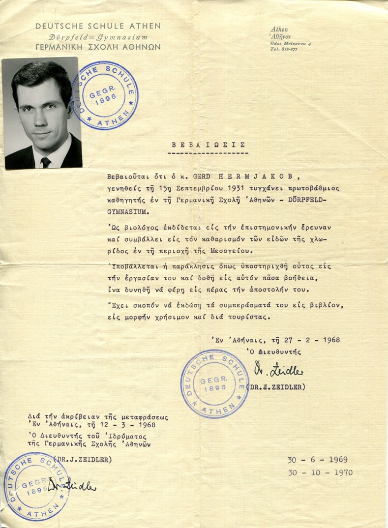 Ο Άρις Μασουρίδης, που είναι σε συχνή επικοινωνία με τον γιο του εκλιπόντος Gerd Hermjacob, έστειλε ένa μοναδικό ντοκουμέντο του 1968, με υπογραφή Joachim Zeidler, όπου βεβαιώνεται ότι ο καθηγητής της βιολογίας διεξάγει έρευνα και πρέπει να υποστηριχθεί, σχολιάζοντας ότι