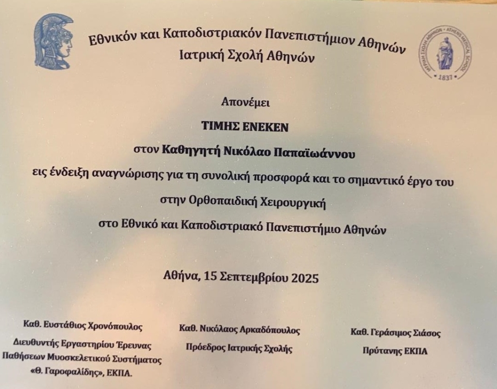 Την Δευτέρα 15.9.2025 βραβεύθηκε ο Νίκος Παπαϊωάννου (απόφ. ’63) από την Ιατρική Σχολή Αθηνών του ΕΚΠΑ στο πλαίσιο της Επετειακής Εκδήλωσης για τα 120 χρόνια Ορθοπαιδικής Χειρουργικής στο Πανεπιστήμιο Αθηνών, που έλαβε χώρα την Δευτέρα 15.9. 2025 στην Μεγάλη Αίθουσα του Πανεπιστημίου Αθηνών (Πανεπιστημίου 30) και οργάνωσαν οι Ορθοπαιδικές Κλινικές και το Εργαστήριο «Θ. Γαροφαλίδης» του ΕΚΠΑ.