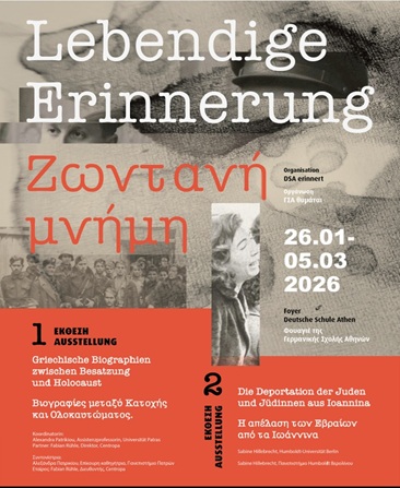 Η μνήμη του Ολοκαυτώματος και της απελευθέρωσης του στρατοπέδου συγκέντρωσης και εξόντωσης Άουσβιτς-Μπίρκεναου στις 27 Ιανουαρίου 1945, πριν από 81 χρόνια, αποτελεί και κατά το τρέχον σχολικό έτος αφορμή για τη Γερμανική Σχολή Αθηνών να τιμήσει τα έξι εκατομμύρια θύματα αλλά και τους επιζώντες του Ολοκαυτώματος από τους Ναζί. Στο πλαίσιο, λοιπόν, του συνθήματος «Ζωντανή Μνήμη», θα φιλοξενήσουμε φέτος δύο περιοδεύουσες εκθέσεις: την έκθεση «Η απέλαση των Εβραίων από τα Ιωάννινα» του Πανεπιστημίου Humboldt του Βερολίνου και την έκθεση «Βιογραφίες μεταξύ Κατοχής και Ολοκαυτώματος στην Ελλάδα» του Πανεπιστημίου Πατρών.