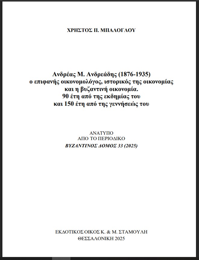 Πρόσφατον δημοσίευμα αναφορικά με την συμβολή του Ανδρεάδη στα οικονομικά του Βυζαντίου. Ο J. M. Keynes [1883-1947] είχε αξιολογήσει την συμβολή του Ανδρεάδη ως την καλύτερη από όλην την συγγραφικήν του παραγωγή. Στο κείμενο θα ιδήτε και απόψεις λογοτεχνών που υπήρξαν μαθητές του στην Νομική. Είχε συγκρουσθή τότε με τον αντισυμβατικό Μ. ΚΑΡΑΓΑΤΣΗ!