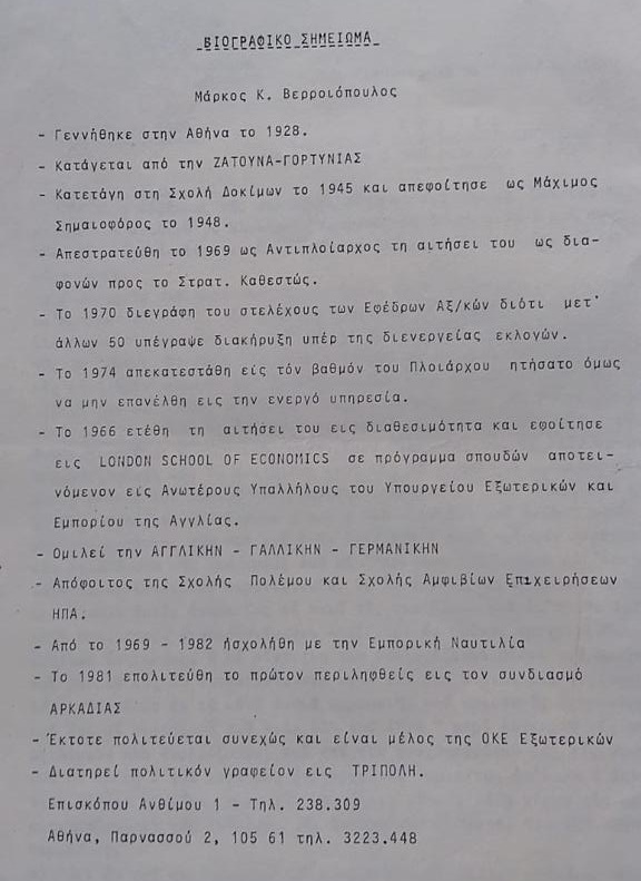 Ο Μάρκος Βερροιόπουλος γεννήθηκε στην Αθήνα το 1928 με καταγωγή από την Ζάτουνα Γορτυνίας. Εμφανίζεται στα Μαθητολόγια της Αραχώβης το έτος 1938-39 στην 1η του 8-ταξίου (Ε’ Δημοτικού) και παραμένει έως την 6η του 8-ταξίου (Δ’ Γυμνασίου) το έτος 1943-44 και αν συνέχιζε θα αποφοιτούσε το 1946. Εκείνη την εποχή, όσοι αποφάσιζαν να καταταγούν στον στρατό είχαν την δυνατότητα αντί να ολοκληρώσουν το γυμνάσιο, να φοιτήσουν σε Στρατιωτική Σχολή.
