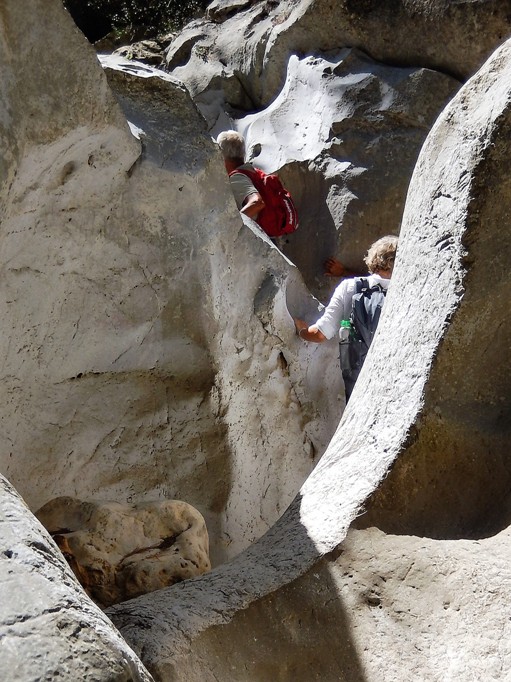Το μονοπάτι αφήνει την ρεματιά. Ανησυχούμε μήπως πάμε στραβά αλλά υπάρχει σήμανση. Τελικά ξαναπέφτουμε στην Ρεκά ψηλότερα. Τώρα είναι στενή. Ξαπλώνω στο στρώμα των βοτσάλων για διάλειμμακαι με πιάνει δυνατή …κράμπα. Ντοματάκια και χαπάκια της Μέλπως το διορθώνουν γρήγορα.Η ρεματιά φαρδαίνει πάλι πολύ. Είναι σημείο κρίσιμο, να βρούμε το σωστό μονοπάτι που οδηγεί στο καταφύγιο. Λίγο από μνήμη, λίγο από τον χάρτη, το βρίσκουμε. Έχουμε ήδη εφτά ώρες που περπατάμε,είναι πέντε το απόγευμα. Ωραίος ήλιος φωτίζει τα πάντα, δάση, ρεματιές, κορυφές. Έχουμε φτάσει στα πόδια της δυτικής οροσειράς. Φαντάζει μεγάλη εμπρός μας και επάνω μας.