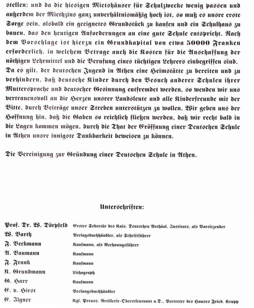 Ήταν οι μόνοι; Όχι βέβαια, ήσαν πολλοί άλλοι και άλλες και κάθε μέρα που ψάχνουμε όλο και ξετρυπώνουμε κάποια ονόματα. Πόσο σπουδαίο ήταν το σχολείο μας εκείνη την εποχή; Ήταν πολύ σπουδαίο, μάζευε την αφρόκρεμα της κοινωνίας. Όλοι θέλανε τα παιδιά τους να πάνε στη Γερμανική. Οι “επώνυμες” οικογένειες δεν το διαπραγματεύονταν και εμείς μόνο σήμερα φαίνεται ότι αγνοούμε παντελώς όλη εκείνη την αίγλη που περιέβαλε την Αραχώβης με τα δύο κτίσματα του Wilhelm Dörpfeld και την προσθήκη του Gustav Eglau με το Treppenhaus (κλιμακοστάσιο) που φιγουράρει στην αφίσα των “Αποφοίτων του Πολέμου”.
