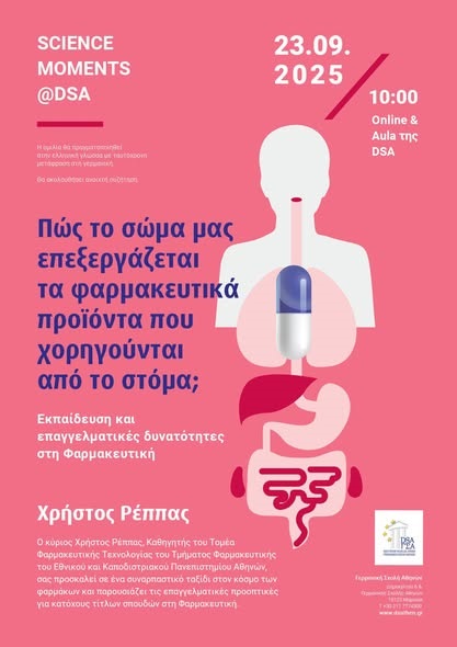 Η πρώτη εκδήλωση για το σχολικό έτος 2025-26 της επιστημονικής σειράς Science Moments «Πώς το σώμα μας επεξεργάζεται τα φαρμακευτικά προϊόντα που χορηγούνται από το στόμα; Εκπαίδευση και επαγγελματικές δυνατότητες στη Φαρμακευτική» ολοκληρώθηκε την Τρίτη 23 Σεπτεμβρίου στην Aula με την παρουσία μαθητών και μαθητριών των τάξεων 11 και 12.