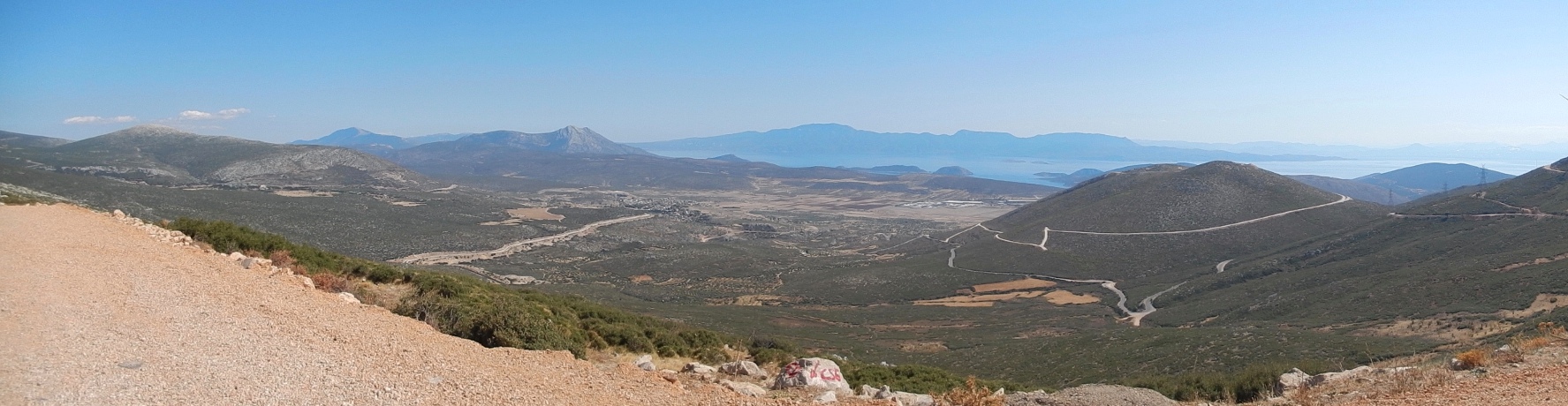 Γυρίζω εκεί που είμαστε: Δόμβραινα, κεφαλοχώρι. Δεν σταματάμε. Παίρνουμε στροφές, ανηφόρα σε ξερό λιθόσπαρτο τοπίο. Πανοραμικές θέες του Κορινθιακού κόλπου: Μέσα σε μεγάλο γυαλιστερό νερό τα καλά νησιά, πίσω η Παλιοβούνα μας των Γερανείων με την Πέτρα δυτικά και τον φάρο του Ηραίου ακόμα δυτικότερα. Μπαίνουμε σε οροπέδιο στα 900μ. υψόμετρο. Είναι η Αγία Άννα στα βόρεια πόδια του κυρίως Ελικώνα. Έλατα. Στενή ρεματιά με την Μεγάλη Λούτσα δεξιά μας. Κατεβαίνουμε με στροφές για το κεφαλοχώρι Κυριάκι. Η Αλουμίνα δίνει δουλειές σε πολλούς. Από ‘κει μέσα σε πράσινους λόφους για Δίστομο. Αριστερά μας, μεγάλη, η Μονή Οσίου Λουκά.