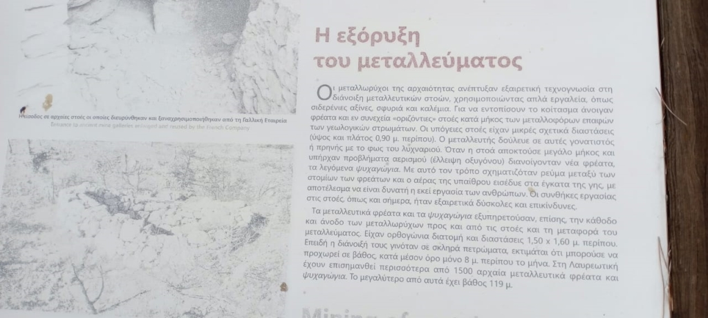 Περπατήσαμε γύρω γύρω με στάσεις για φωτογραφίες. Είπαμε και για την μεταλλευτική ιστορία του τόπου. Τον 4ο και 3ο αιώνα π.χ. η αρχαία Αθήνα είχε σημαντικό έσοδο από τον άργυρο και μόλυβδο της περιοχής. Με το ασήμι αυτό, ο Θεμιστοκλής έπεισε τους Αθηναίους να χτίσουν διακόσιες τριήρεις που ναυμάχισαν στην Σαλαμίνα λίγα χρόνια αργότερα. Οι δούλοι, σε απάνθρωπες συνθήκες, έσκαβαν σερνάμενοι σε οριζόντιες στοές ακολουθώντας την φλέβα μεταλλεύματος.