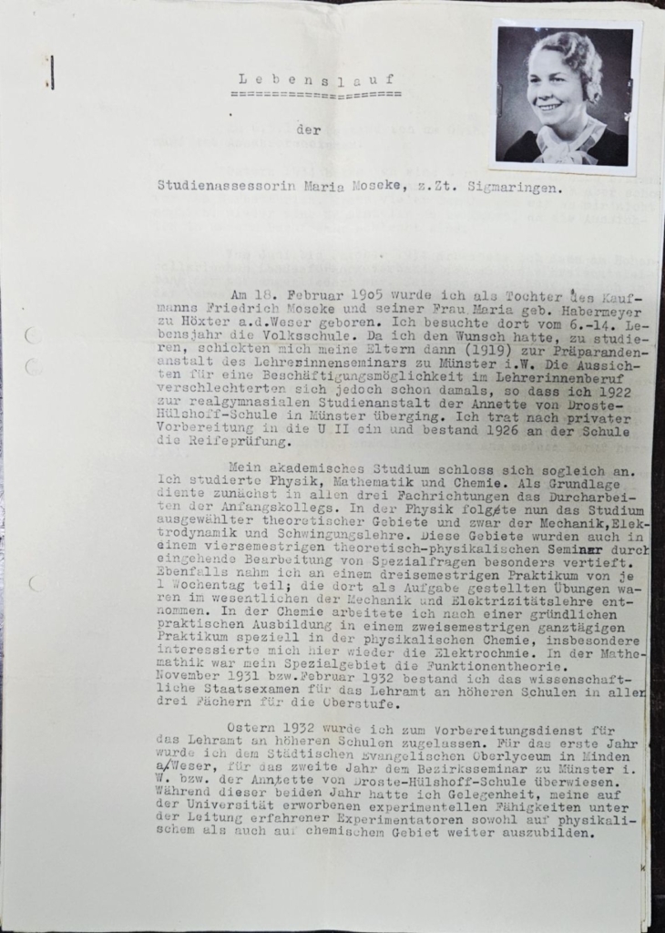 Γεννήθηκε στις 18.2.1905 στο Höxter a.d. Weser στην Βεστφαλία. Ο πατέρας της, Friedrich Moseke, ήταν έμπορος και η μητέρα της ήταν η Maria Habermeyer και την έστειλαν στο τοπικό σχολείο από το 6ο έως το 14ο έτος της και το 1919 την έστειλαν στο Münster προκειμένου να παρακολουθήσει προπαρασκευαστικά σεμίναρια για καθηγήτριες ώστε να ακολουθήσει κατεύθυνση εκπαιδευτικού. Έτσι το 1922 εισήλθε στην Σχολή της Annette von Droste-Ηülshof Schule και το 1926 απέκτησε την άδεια ασκήσεως επαγγέλματος. Ακολούθως σπούδασε Μαθηματικά, Φυσική και Χημεία και το 1932 παρακολούθησε τμήματα και απέκτησε την άδεια να διδάξει σε ανώτερα σχολεία.