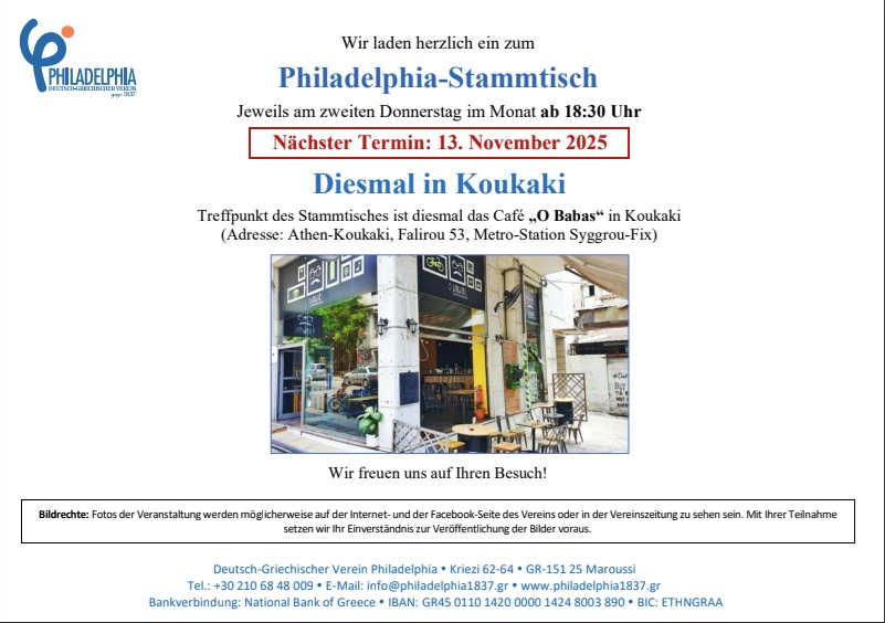 Einladung zum Philadelphia-Stammtisch am 13. November 2025 ab 18.30 Uhr im Café „O Babas“ in Koukaki.